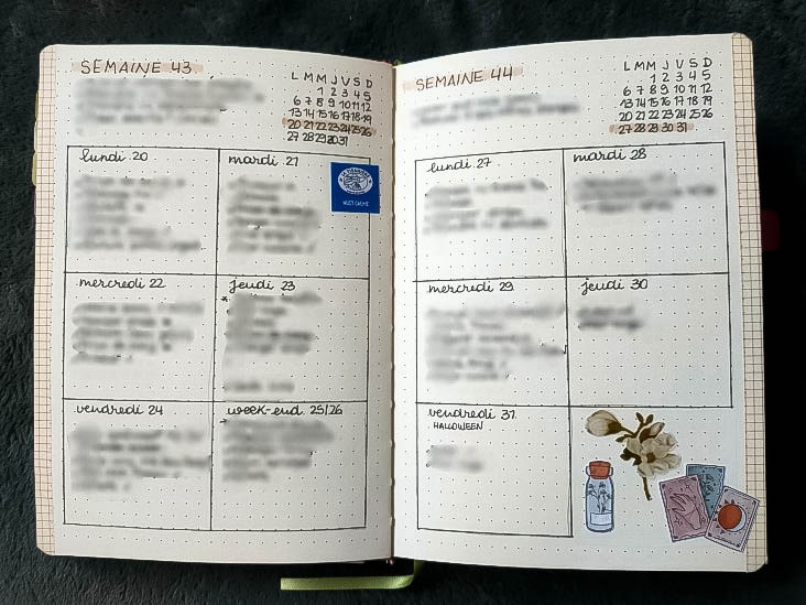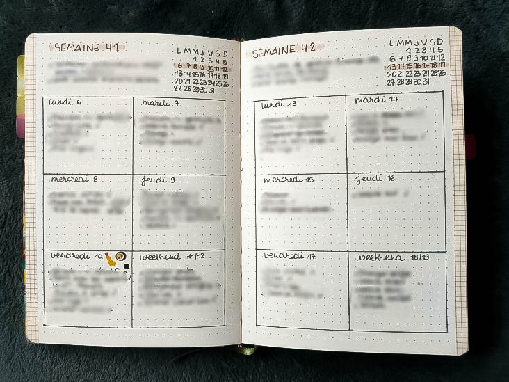 - Les semaines du mois (noter les tâches/rdv pour chaque jour)