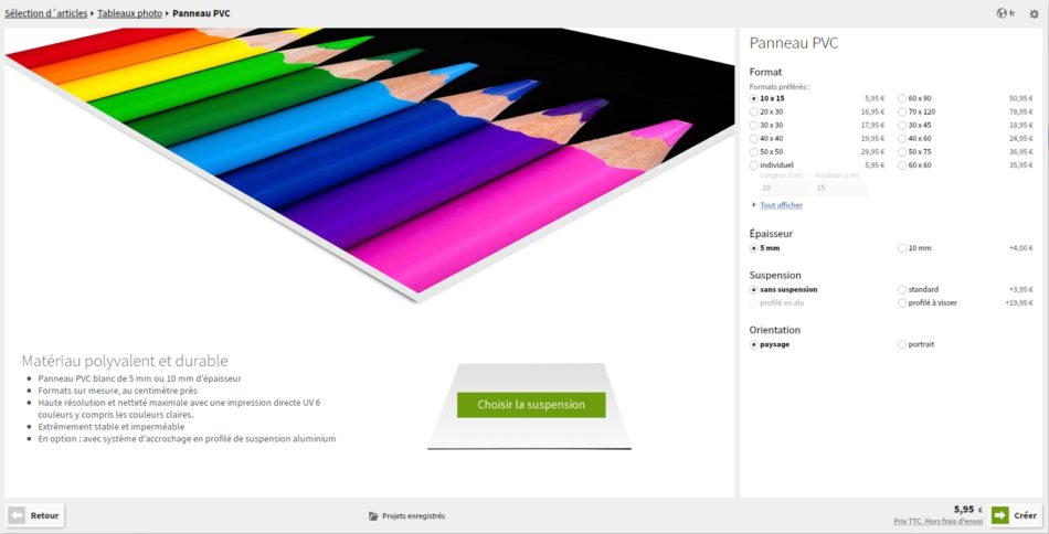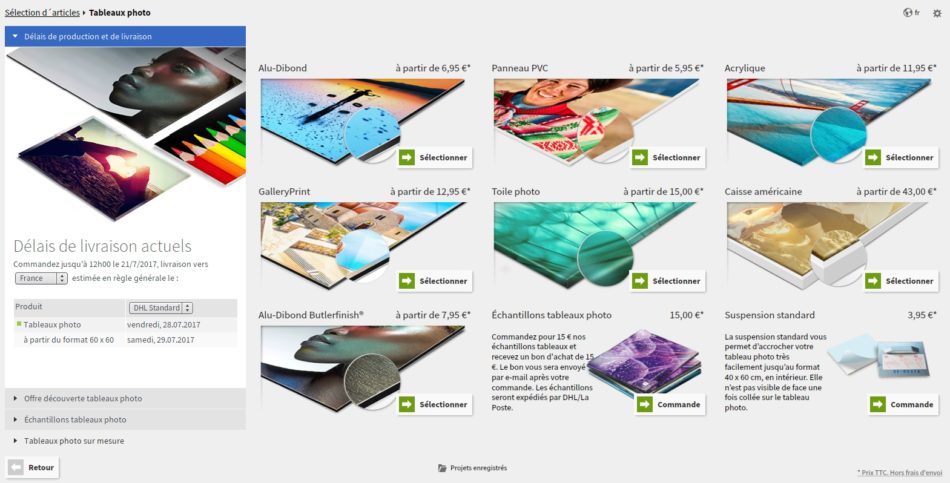 Sélectionnez ce que vous souhaitez créer et ensuite vous aurez le choix de choisir le matériau pour la future impression de votre photo. Vous aurez aussi le choix de la dimension que vous souhaitez. Pour le tableau que j’ai reçu, j’ai choisi les dimensions 70×40 centimètres.